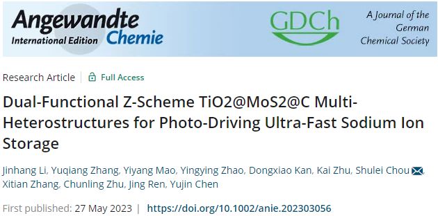 该研究成果以“双功能Z型TiO2@MoS2@NC多异质结构用于光驱动超快钠离子存储”为题发表在国际顶级学术期刊《德国应用化学》(Angewandte Chemie International Edition)上,这是我校首次以第一单位在该期刊上发表学术成果,实现了在该领域顶级学术期刊发表成果的新突破。