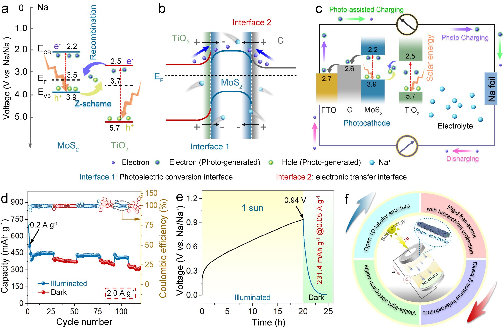 近日,我校物理与光电工程学院微纳光电材料与器件课题组构建的兼具光电转换界面和电子传输界面的双功能光电极,成功实现了太阳能充电钠离子电池,并详细阐述了双功能光电池在光照下的储能机理,为储能半导体材料在光电池储能领域的应用提供了理论基础。